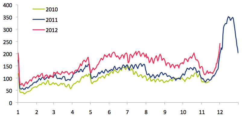 Demand for charter flights has climbed steeply, seemingly in anticipation of the year-end holiday season, according to the latest data from online charter portal Avinode. As of December 1, the company’s forward-looking demand index for the following 30 days stood at 241.78, almost 95 points above where it had been on November 1. This was also almost 42 points higher year-over-year.